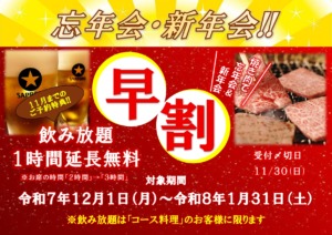 当店では、本日より忘年会新年会に向けた早割キャンペーンを実施いたします!